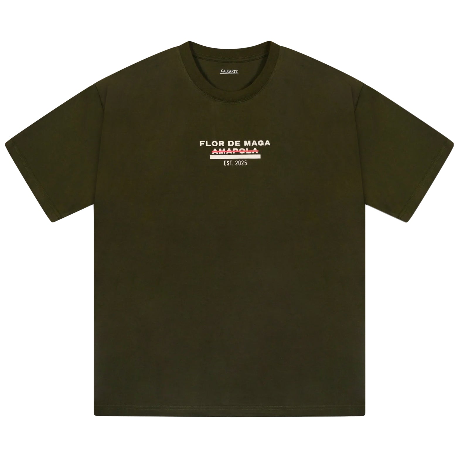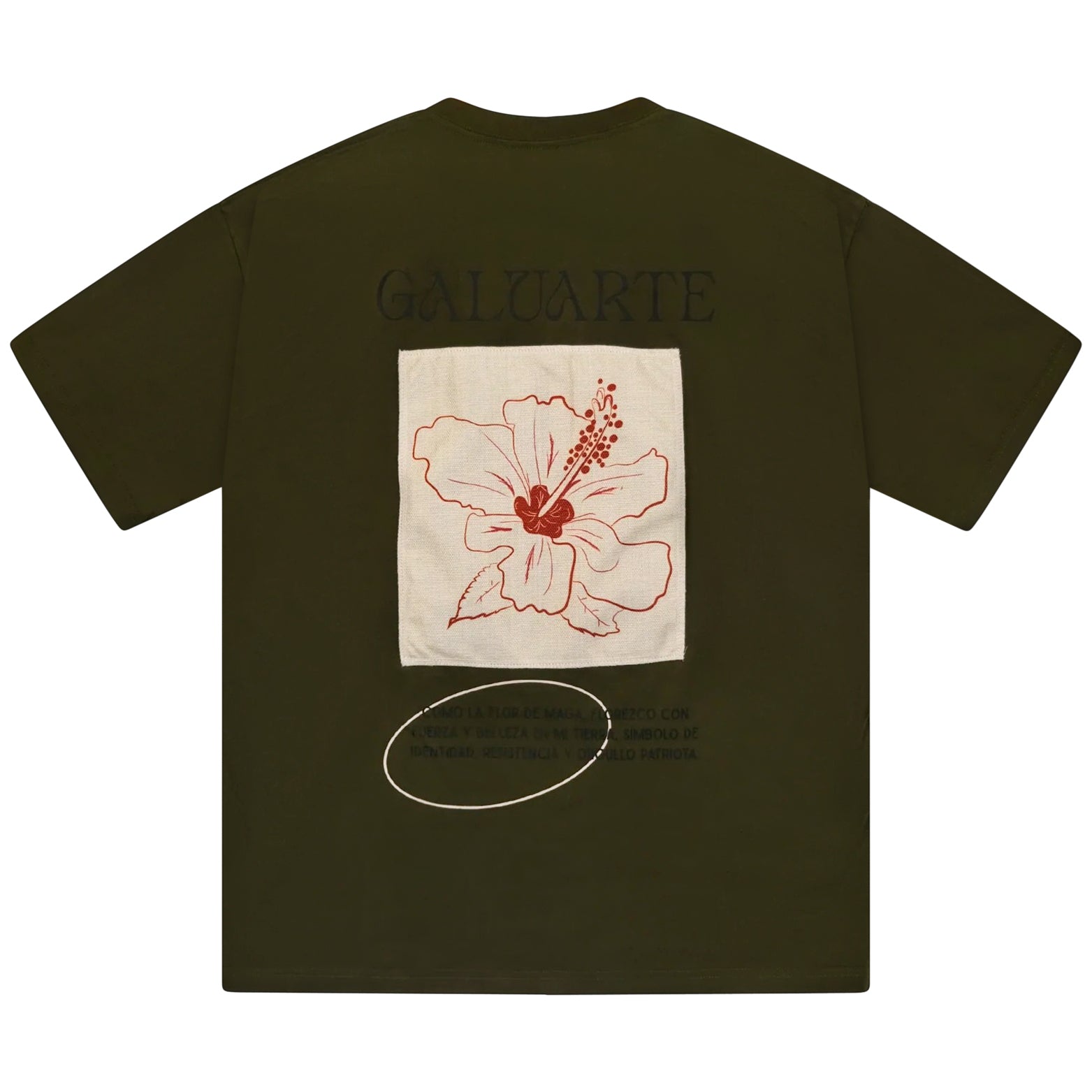 Inspirada en el orgullo y la fuerza de nuestra isla, esta pieza honra la flor nacional con un diseño que fusiona tradición y estilo contemporáneo. En la parte de alfrente, la palabra Amapola tachada en rojo, significado de la confucioón común en la isla entre las dos flores. En la parte trasera, una flor de maga impresa en lino y bordada con detalle la convierte en una pieza única.