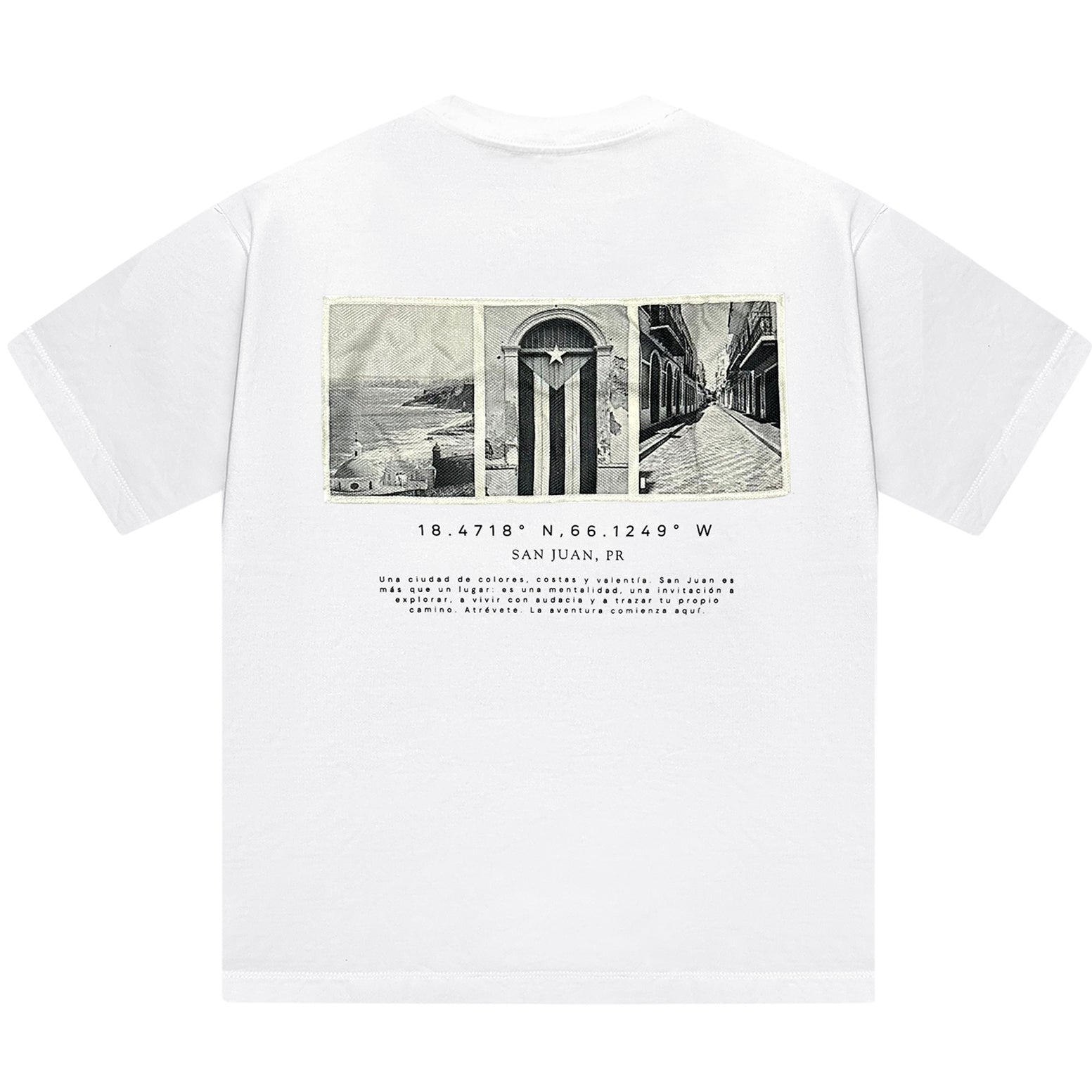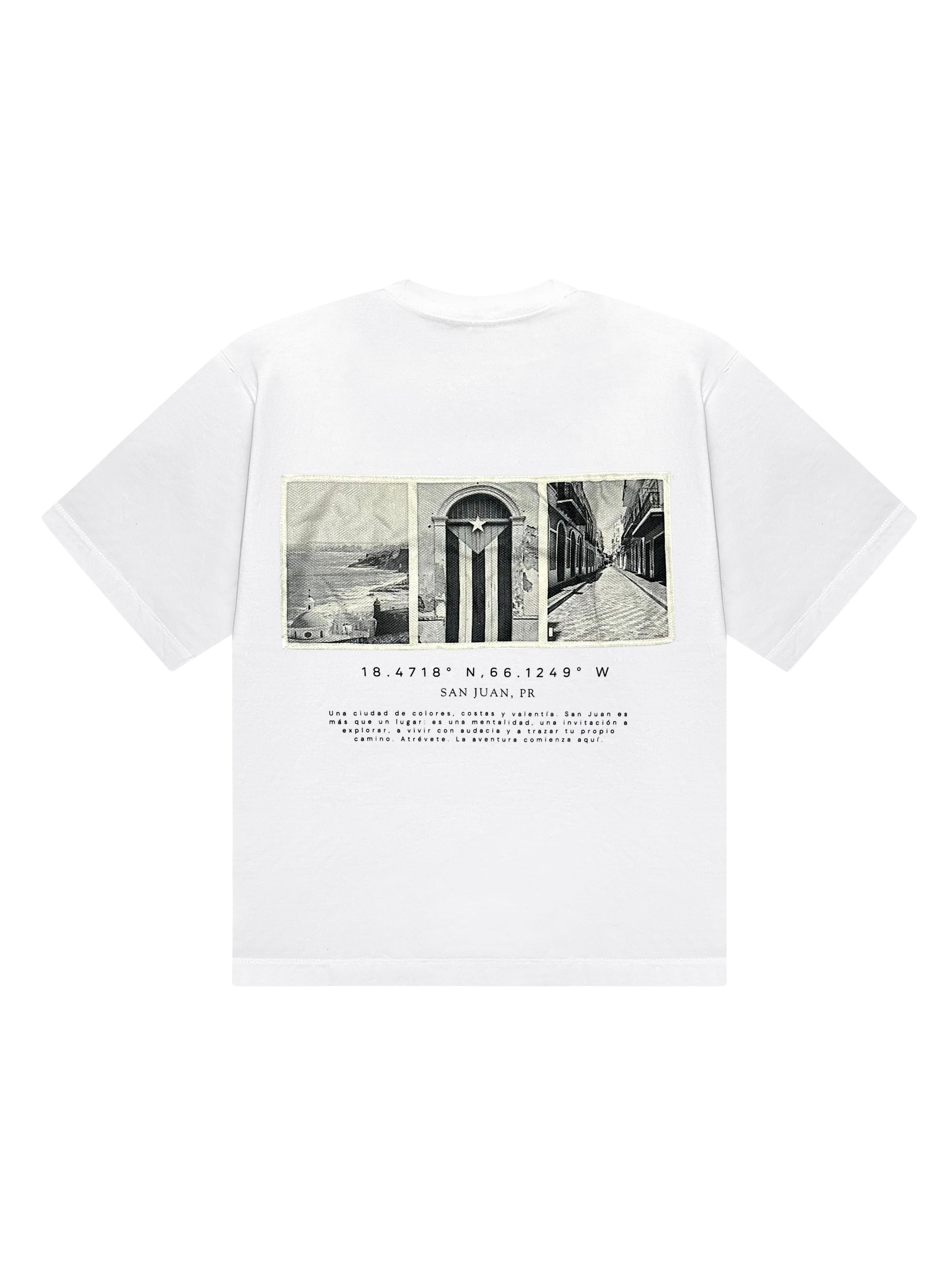 Description: The Galuarte “SJU” Tee - Oversized tee that captures the essence of San Juan, PR. The graphic designs are printed on canvas fabric and sewn on the back. It also features the city’s coordinates and iconic scenes. With a relaxed fit and unique details, this piece combines comfort and style for those who live fearlessly. #TakeTheRisk