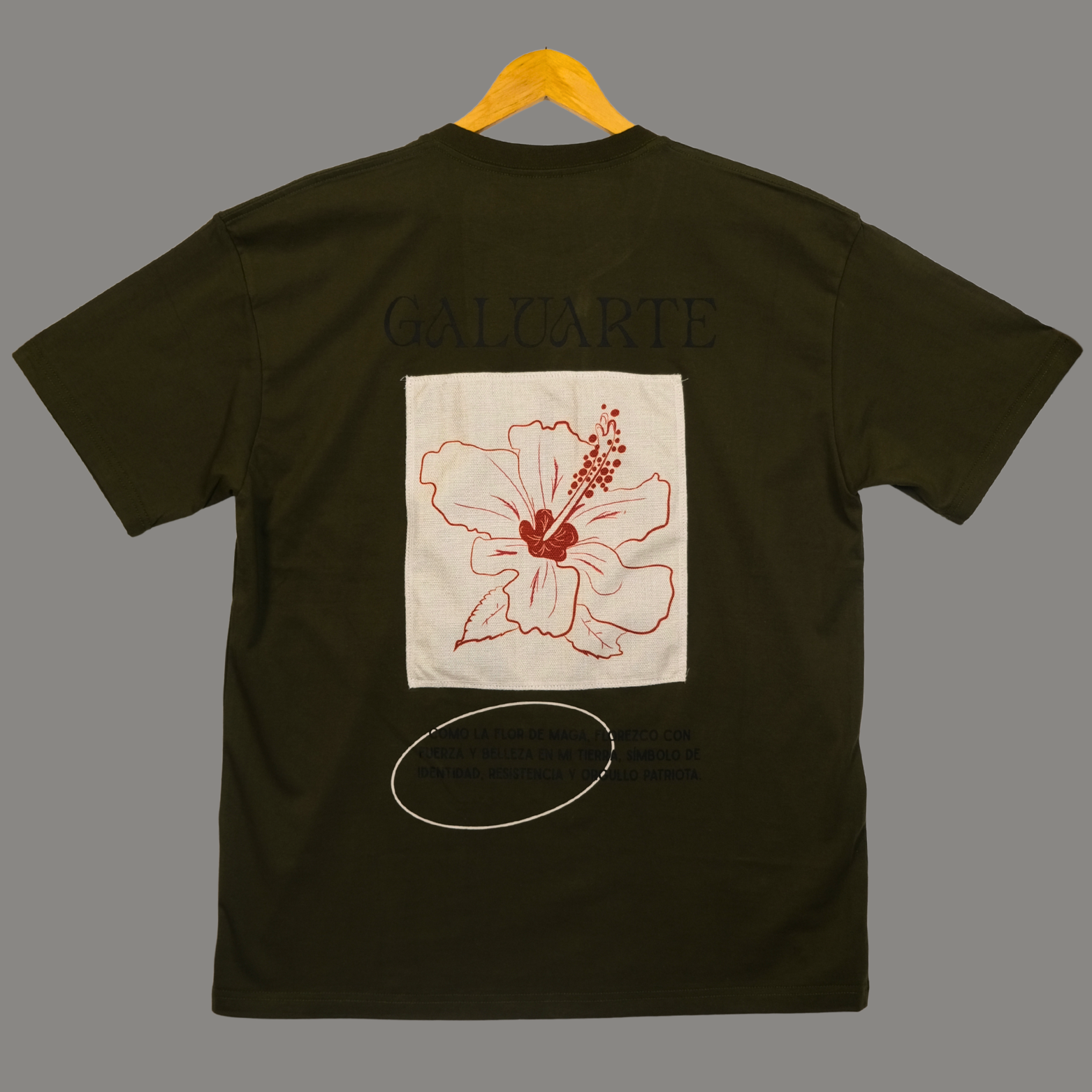 Inspirada en el orgullo y la fuerza de nuestra isla, esta pieza honra la flor nacional con un diseño que fusiona tradición y estilo contemporáneo. En la parte de alfrente, la palabra Amapola tachada en rojo, significado de la confucioón común en la isla entre las dos flores. En la parte trasera, una flor de maga impresa en lino y bordada con detalle la convierte en una pieza única.